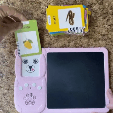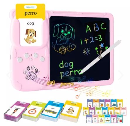 Incluye tarjetas flash parlantes con sonidos reales de coches y animales, y una tableta de escritura LCD para dibujar y practicar escritura. Es una herramienta 2 en 1 que estimula la atención y la creatividad mientras los niños aprenden jugando.